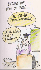 Preguntado al público si eran pacientes de dolor crónico o profesionales fue fácil explicar ¿qué es el dolor?, y en ese caso tiré un poco de humor, y así a través de una imagen recalcar este último, el propio y el ajeno, igual de importantes y no necesitados de comparaciones.