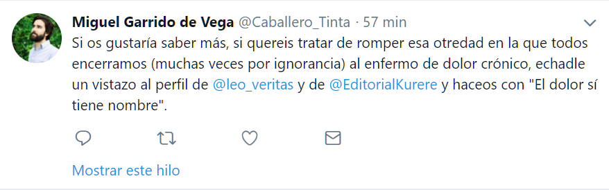 Miguel (@Caballero_Tinta) con quien comparto genes y amor por la palabra escrita comentó lo apropiado del título, apuntando para ello el término de la “otredad”, la necesidad de reconocer la existencia de otro, porque a veces por ignorancia, olvidamos al enfermo de dolor crónico. En su opinión le gustaba el título, pues mi intención no ha sido otra que la de recordar que existe un nombre propio detrás de cada paciente de neuralgia trigeminal o de dolor crónico.